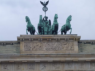 Wat deden wij verder vandaag? Lopen, heel veel lopen. Langs o.m. de Brandenburger Tor, de Reichstag, de Berliner Dom, Checkpoint Charlie, door het monument voor de in Europa omgebrachte Joden, het museum van de Berlijnse Muur. We lunchten in de Mall of Berlin, een supergroot winkelcentrum, dat is gebouwd aan de Leipziger Platz. In de jaren twintig was hier ook een luxueus warenhuis. Door de DDR is alle bebouwing in een brede zone gesloopt om een vrij zicht- en schootsveld te hebben richting de muur. Nu zijn de gaten weer gevuld met bebouwing en is er dus ook een (nog veel groter) winkelcentrum op dezelfde plaats als eerst.